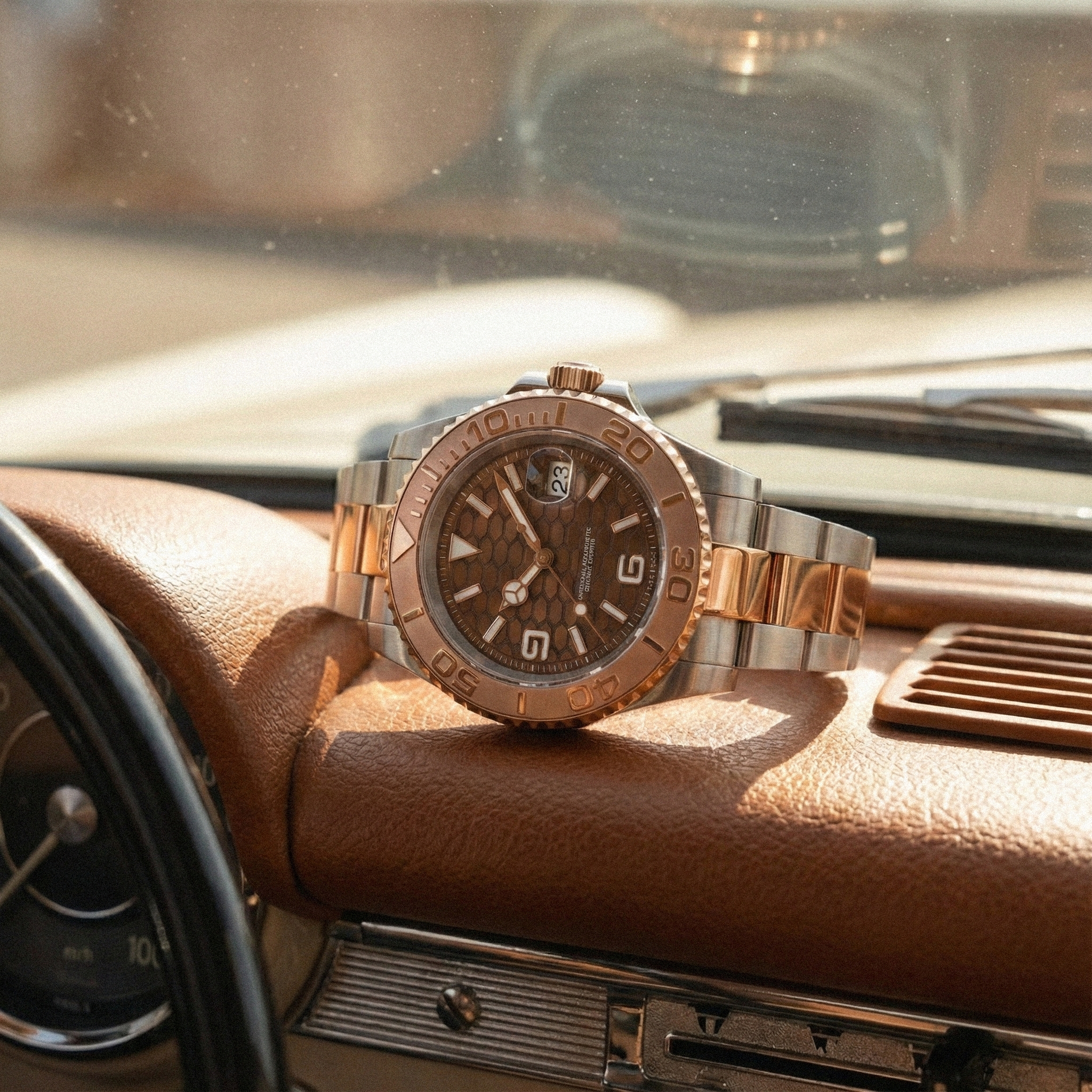Introducing The Mariner - Copperstone, a luxury timepiece inspired by the iconic Rolex Submariner. Featuring a striking rose gold bezel and case, paired with a 2 tone rose band and a sleek brown face. Elevate your style with the exclusive and sophisticated design of Copperstone.