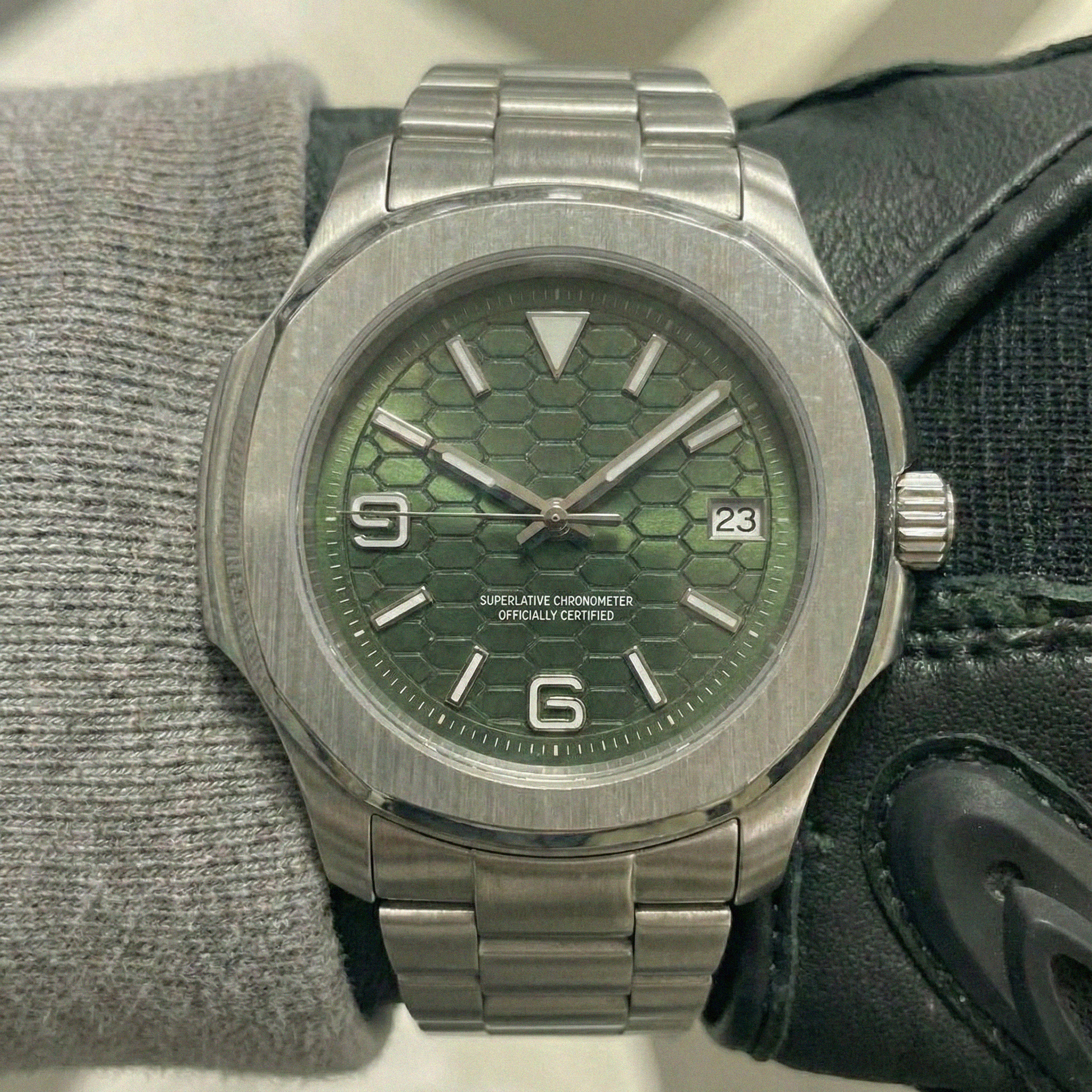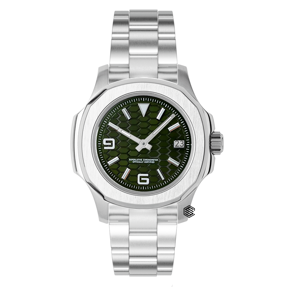Discover the beauty of The Voyager - Emerald Serpent. Inspired by the iconic Patek Aquanaut, this luxurious timepiece features a stunning green hexagon dial that exudes sophistication and elegance. Perfect for those who appreciate the finer things in life, the Emerald Serpent is a must-have addition to any collection.
